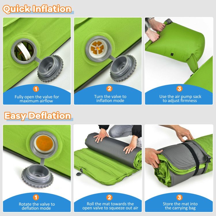 Quick setup: No need to buy and carry an extra air pump. This sleeping pad is designed with a double-sided valve which makes inflation and deflation a breeze. You just need to fully open the valve for maximum airflow, then turn the valve to the inflation mode and use the air pump sack to adjust firmness. To deflate, flip the valve to deflation mode, roll the mat towards the open valve to squeeze out air, and then store it in the bag.
